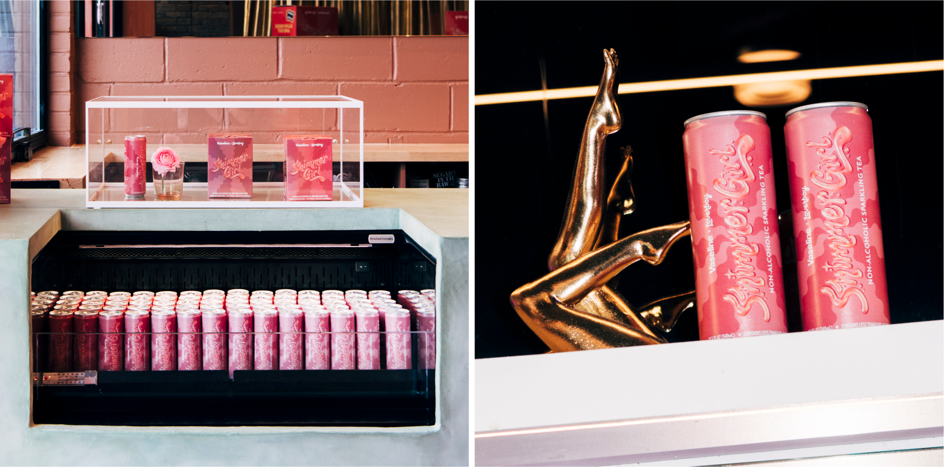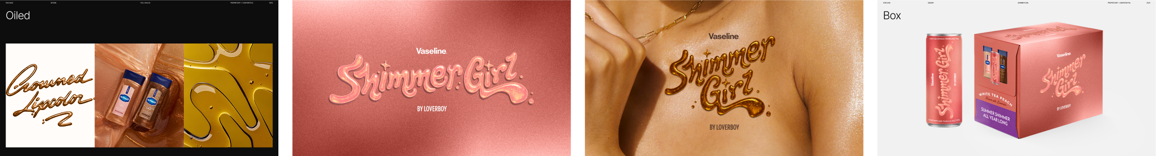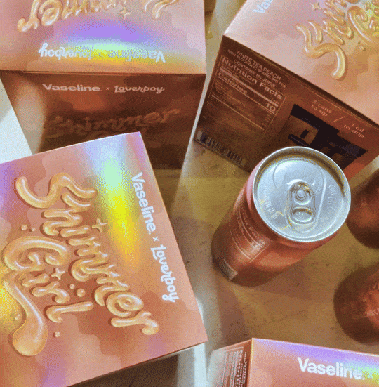 Visually, the design system unified both brands through shimmer-led textures, a hero pink connecting Vaseline’s Sunlit Glow Gel Oil with Loverboy’s original tea flavor, and iconic Vaseline blue accents. Hand-drawn typography enhanced with AI-driven visual effects, paired with holographic packaging treatments, brought the collaboration to life—creating a playful, girlie pop-inspired world designed to boost confidence and glow.